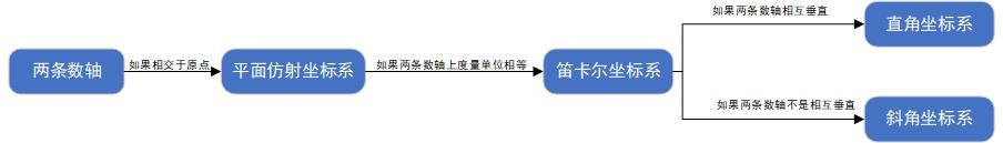 相交于原点的两条数轴,构成了平面仿射坐标系。 如两条数轴上的度量单位相等,则称此仿射坐标系为笛卡尔坐标系。