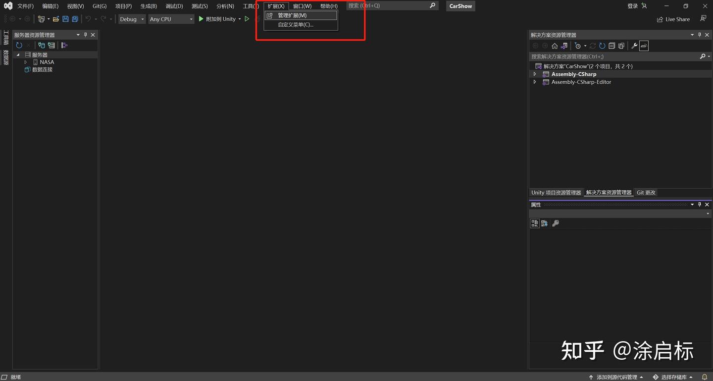 1.在VS的顶部菜单栏中,依次找到=>扩展-管理扩展,打开扩展管理界面。
