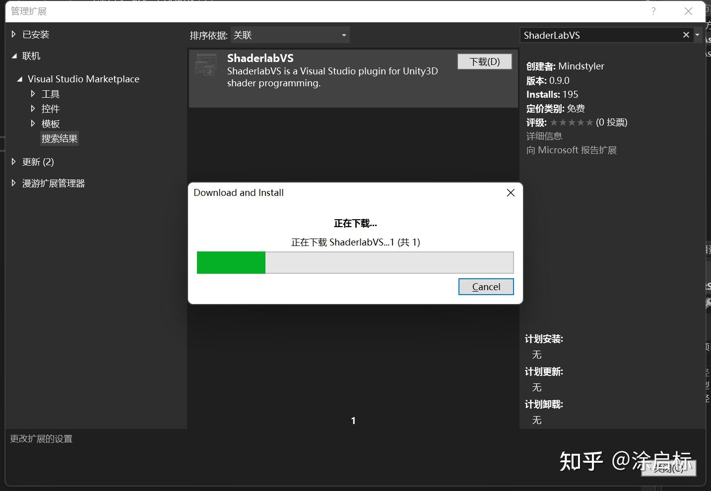 2.在扩展管理的搜索栏中输入:ShaderLabVS进行搜索,并下载,关闭VS窗口后开始安装。