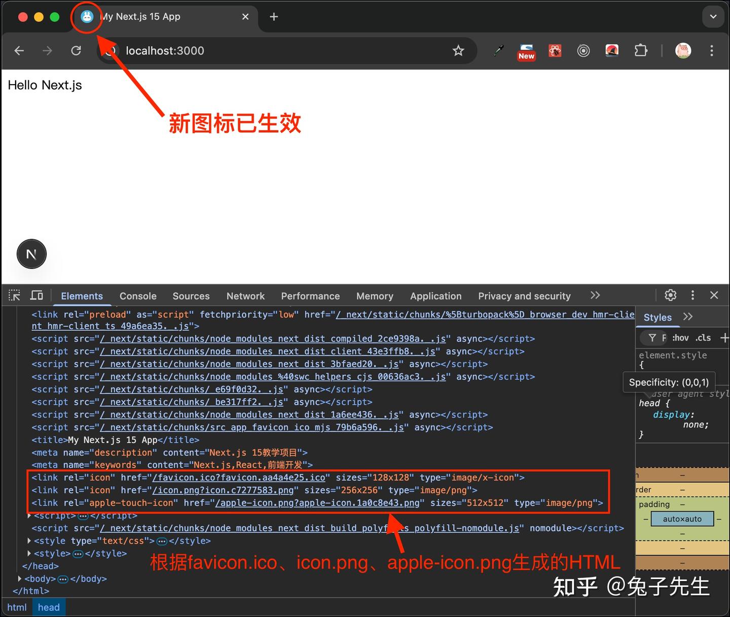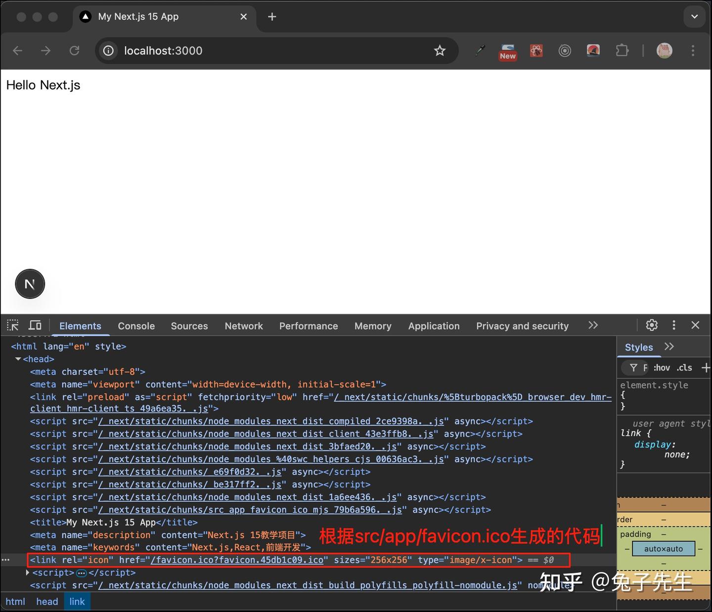 Next.js会默认将 src/app/favicon.ico 作为网站图标,并生成对应的HTML代码,如图:
