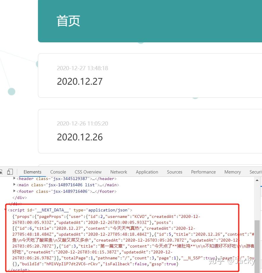 我们可以看到玄机就藏在 id 为 _NEXT_DATA__ 的 script 标签中,里面储存了传给前端的 props 数据