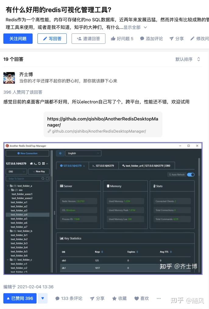 Another Redis Desktop Manager 的作者也是真大佬!在知乎“有什么好用的 Redis 可视化管理工具?”提问下面,大佬直言目前市面上的 Redis 可视化管理工具都不怎么好用,于是,自己写了一个。或许这就是大佬吧!