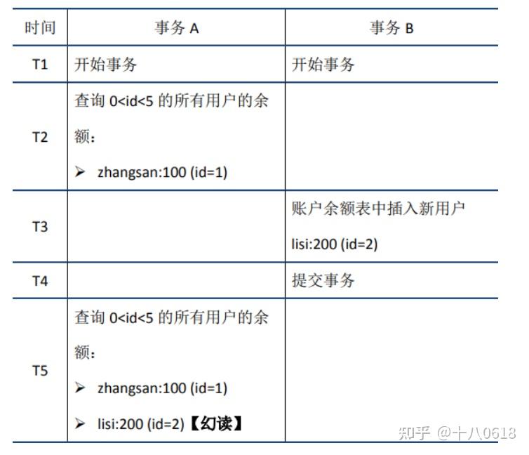 (3)幻读:在事务A中按照某个条件先后两次查询数据库,两次查询结果的条数不同,这种现象称为幻读