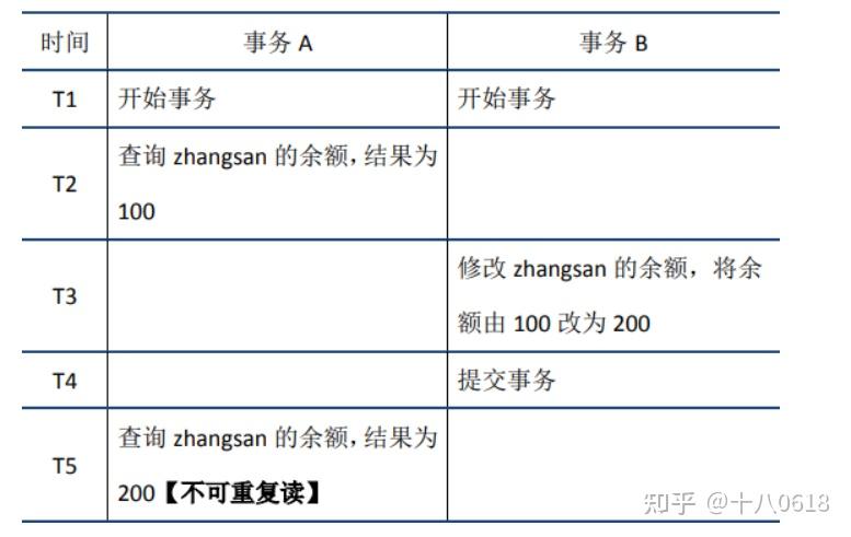 (2)不可重复读:在事务A中先后两次读取同一个数据,两次读取的结果不一样,这种现象称为不可重复读
