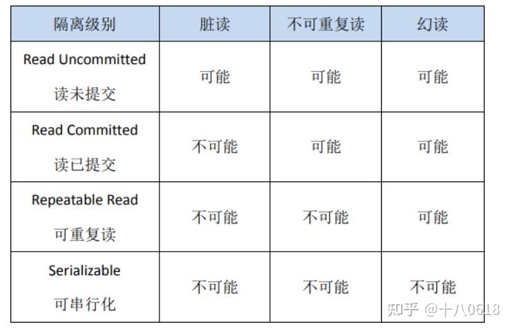 SQL标准中定义了四种隔离级别,并规定了每种隔离级别下上述几个问题是否存在。一般来说,隔离级别越低,系统开销越低,可支持的并发越高,但隔离性也越差。隔离级别与读问题的关系如下: