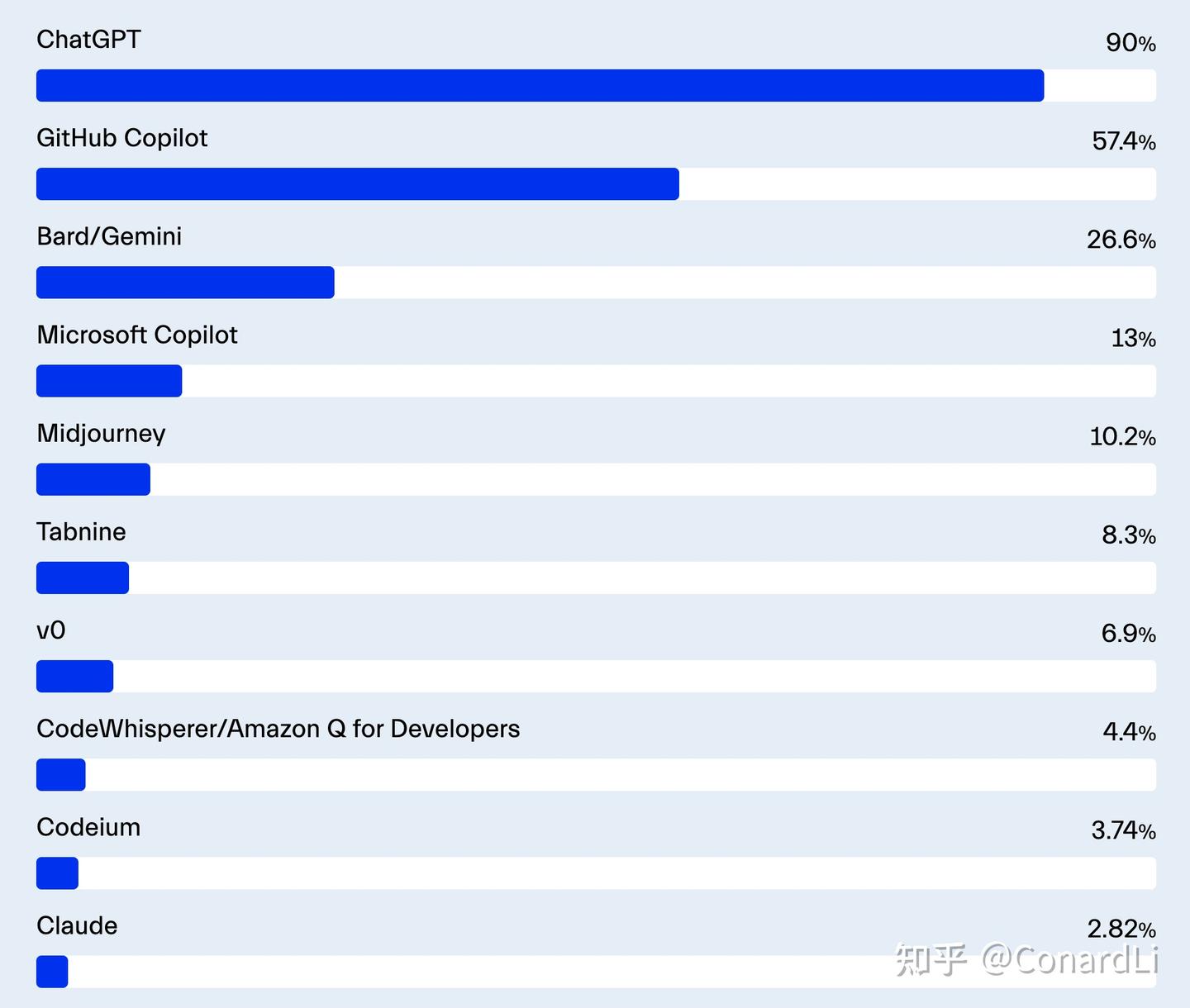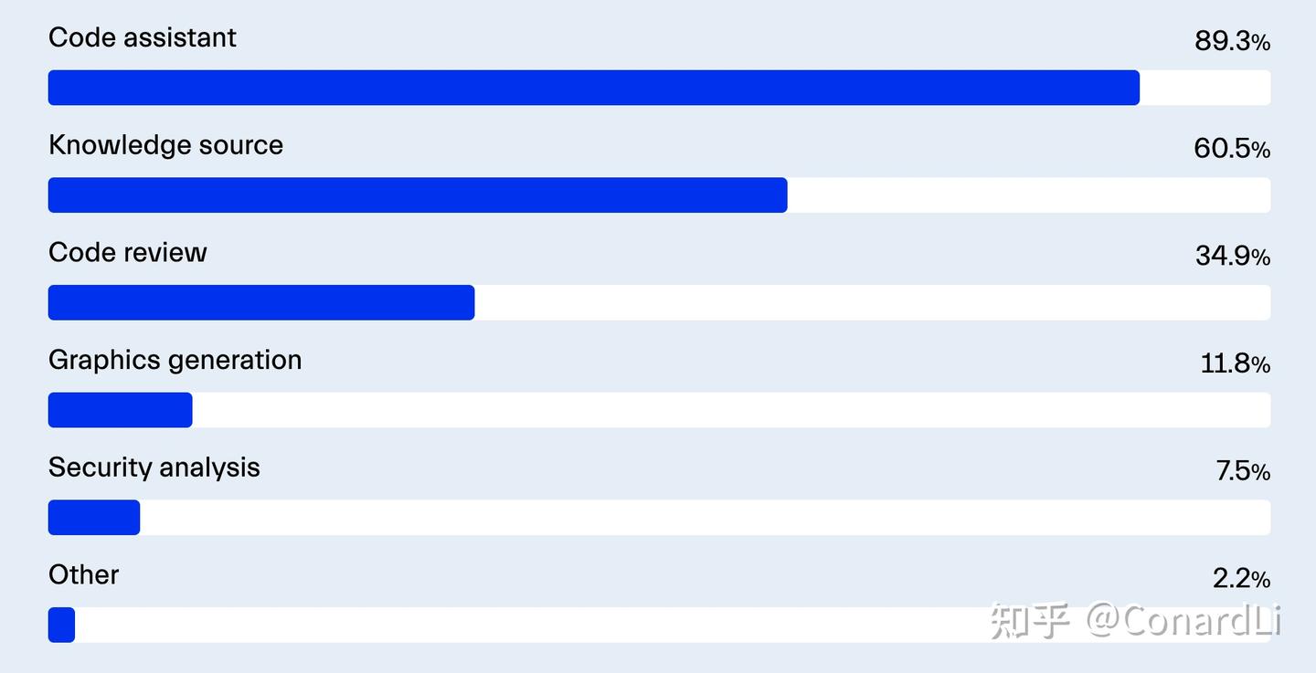 ChatGPT 在这股潮流中处于领先地位,90% 的开发者使用它。除了辅助编码,许多人(包括我自己)发现它在问题解决、教学和学习资源方面非常有价值。