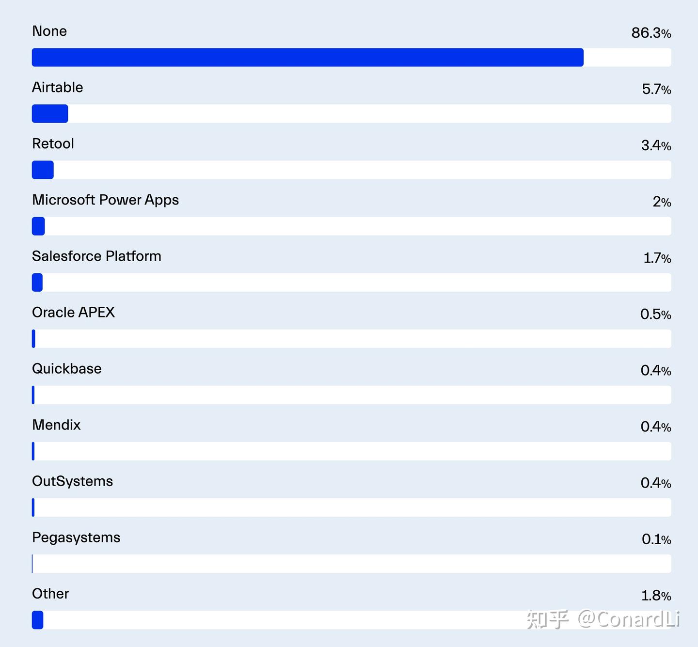 在低代码工具中,Airtable(5.7%)和 Retool(3.4%)位居前列,主要用于内部解决方案。 让我惊讶的是 Flutterflow 的结果(0.12%),这个位年轻的平台可能在不久的将来颇具潜力。它基于一个流行框架,为创建移动应用提供了快速发展的可视化开发环境。我预计其统计数据将大幅增加,特别是考虑到像 Axis 这样的大型银行正在使用这项技术服务于 5000 万用户。