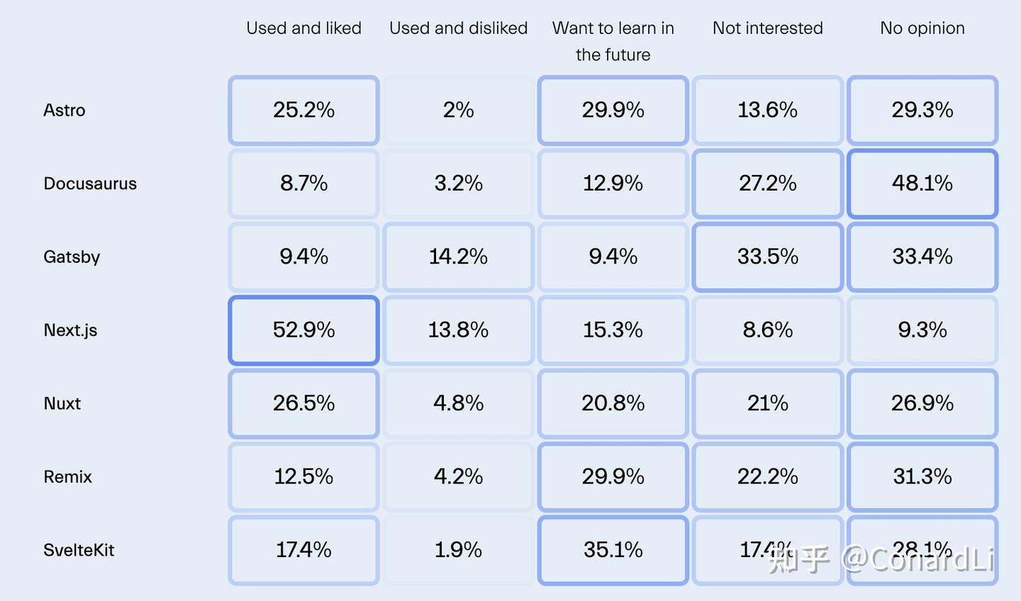 Create React App (CRA) 的反馈则较为两极分化,满意率为 31.3%,不满意率为 31.5%。最初由 Facebook 开发以便捷启动 React 应用,CRA 不再推荐用于生产级别的 React 项目。React 官方文档现在建议使用 Next.js、Remix 或 Gatsby,这些框架提供服务端渲染、静态站点生成和增强性能,这些功能是现代应用越来越需要的。