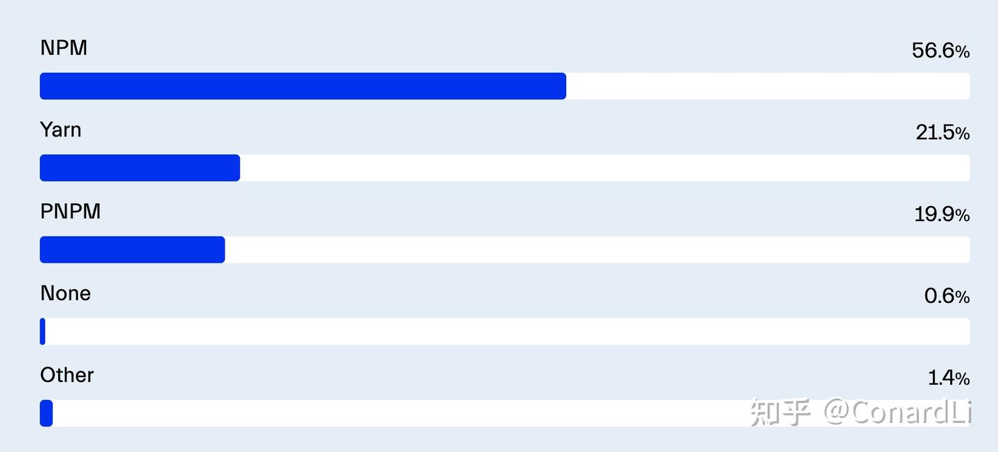 PNPM正迅速受到欢迎,反映了对其独特包管理方法的日益关注。其主要吸引力在于高效处理依赖项,尤其是通过不重复系统来节省磁盘空间——这是具有复杂依赖树项目的一个优势。PNPM的性能改进使其成为一个有吸引力的替代品,特别是当开发者寻求更快的CI/CD管道和更好的开发者体验时。 - Bun 的新兴兴趣:尽管在调查中没有正式列出,