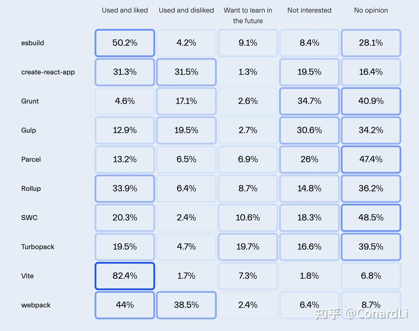 尽管 Webpack 使用率相似,但用户反馈表现明显不同。只有 44% 的 Webpack 用户表示满意,38.5% 的用户因其复杂性和难以配置而感到困扰。