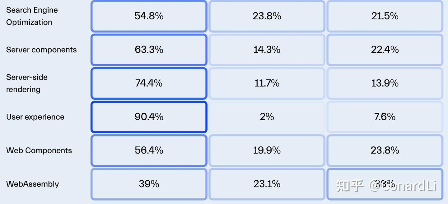 在最新的调查中,有69.9%的受访者表示他们正在使用 React,这让 React 毫无悬念地占据了排行榜的首位。React 日益壮大,我们看到社区不断采用新的方法来构建各类解决方案,无论是渐进式 web 应用、服务器端渲染应用、单页面应用,还是静态网站。它在市场上的主导地位也使得像 Next.js 这样的框架迅速流行起来。Next.js 框架通过其丰富的服务器端渲染、路由体系以及早期对 React 19 特性的采用,证明了其在各种解决方案中的优异性能和可扩展性。