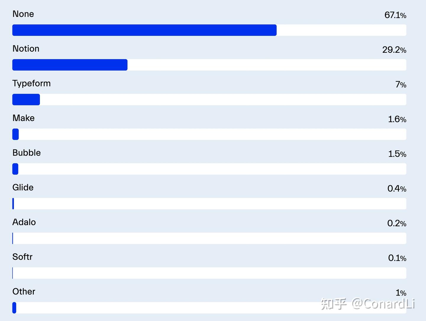 在零代码工具类别中,以 Notion(29.2%)和 Typeform(7%)为主,表明这一类别有广泛的工具选择。无代码工具主要用于信息管理和在线表单,而非应用程序构建或自动化平台。