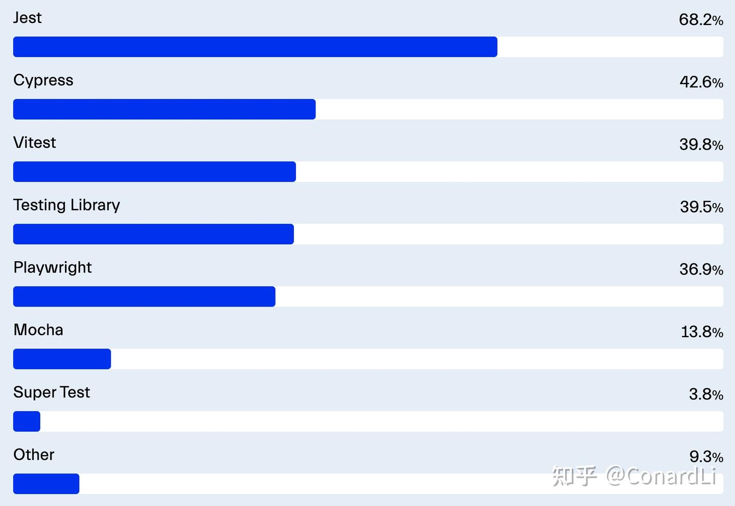根据我的经验,趋势正逐渐转向使用 Vitest(39.8%)进行单元测试,特别是因为 Vite 在各种 JavaScript 框架中越来越流行。