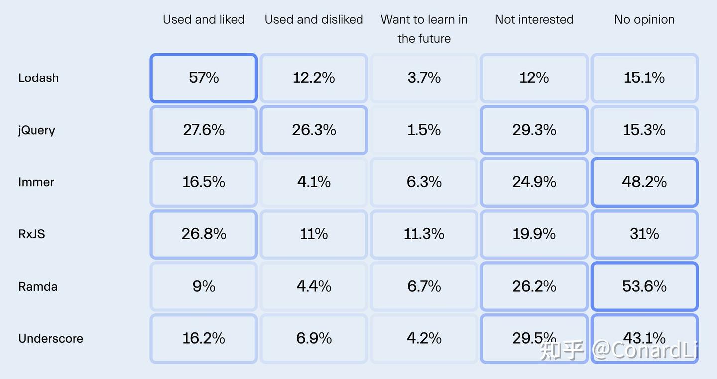 然而,有趣的是,只有3.7%的用户有兴趣在未来学习它。这可能表明 Lodash 已经很好地集成到许多项目中,或者开发者更多地在关注现代 JavaScript 特性和提供类似功能的替代库。