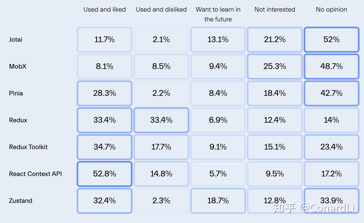 毫不奇怪,Redux 和 Redux Toolkit 仍然占主导地位,使用率分别为33.4%和34.7%。Redux 的强大生态系统和成熟功能使其成为许多项目中的关键工具,而 Redux Toolkit 带来的增强功能则进一步提高了其吸引力。然而,约三分之一的开发者仍然不青睐 Redux,这表明其复杂性和开销在某些新框架的背景下可能是一个缺点。