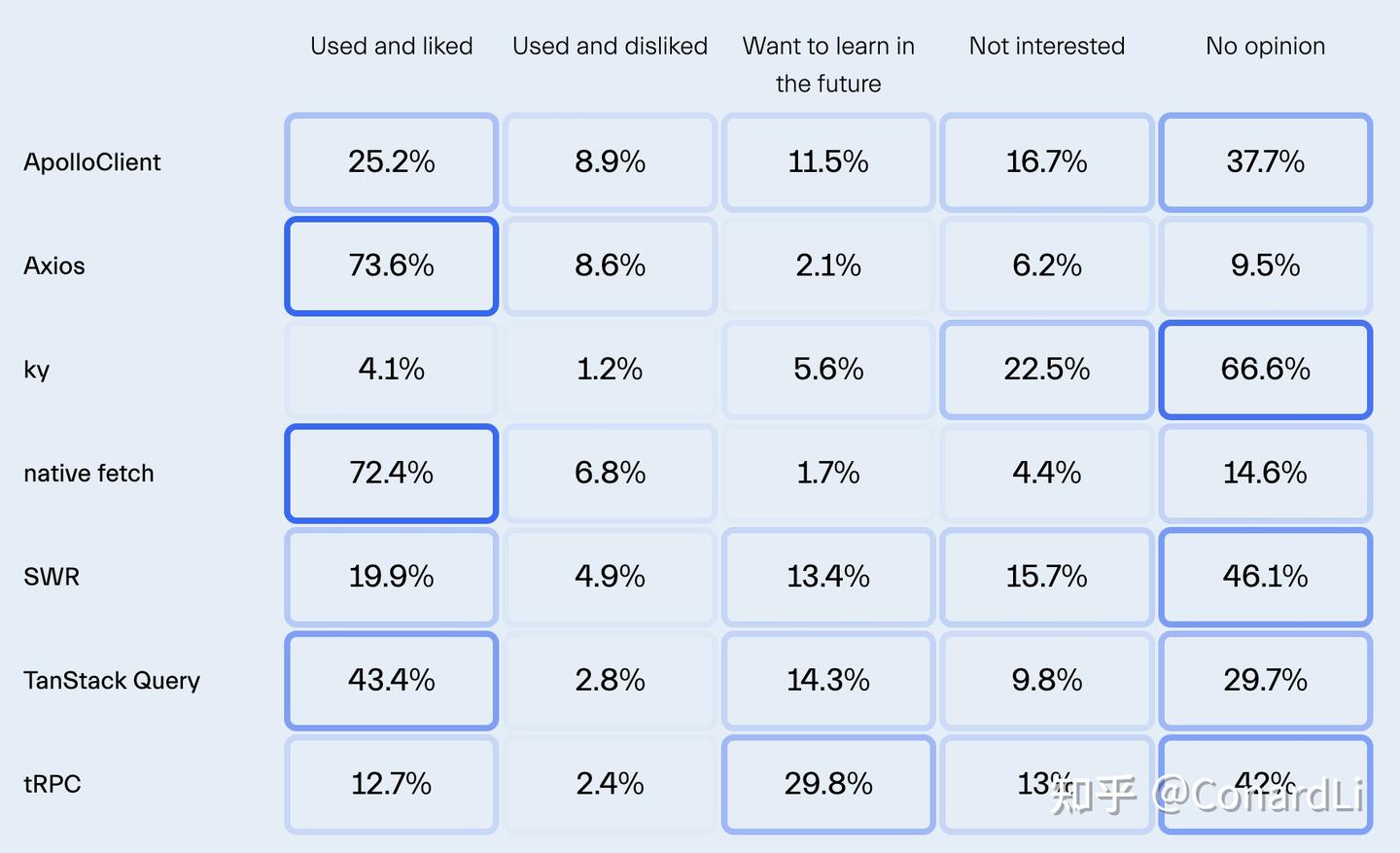 尽管有趣,SWR(19.9%)并没有像 TanStack Query 那样受欢迎,尽管它是由 Vercel 开发的。这表明,即使有大公司的支持,在技术世界中也未必能保证广泛的采用。同时,ApolloClient 的持续高使用率(25.2%)反映了 GraphQL 在开发中的持久受欢迎程度。