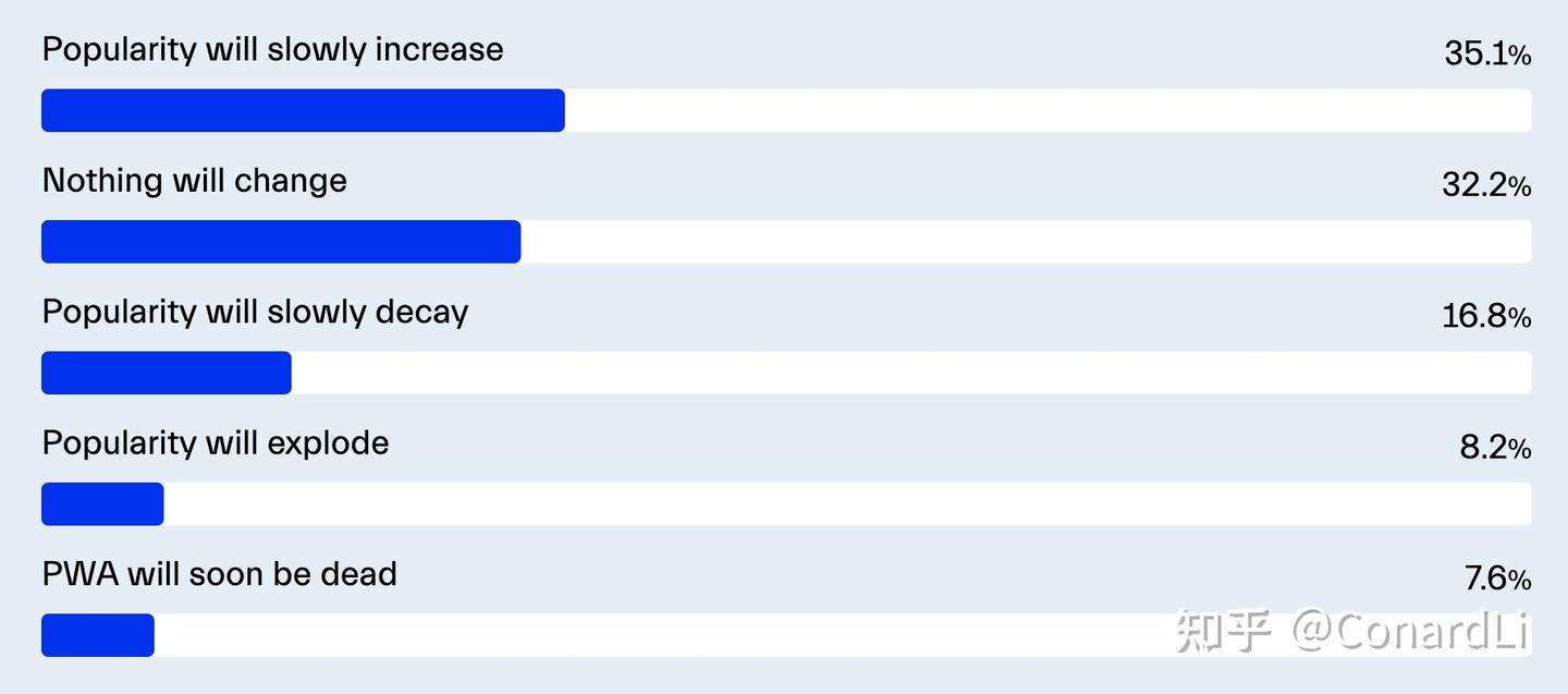 尽管如此,只有 35% 的受访者认为这种上升趋势会继续,而另有 30% 则认为 PWA 的发展不会有太大变化,这可能是由于缺乏认知或使用导致的。
