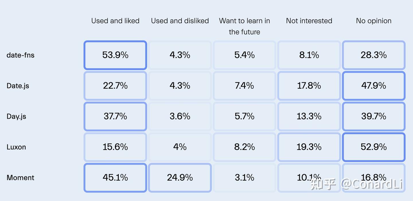 另一方面,虽然 Moment.js 仍然受到45.1%用户的欢迎,但显著的不满意率(24.8%)显示了偏好的变化。我遇到过 Moment.js 的尺寸和性能不太理想的情况,这使得转向替代方案更加吸引人。