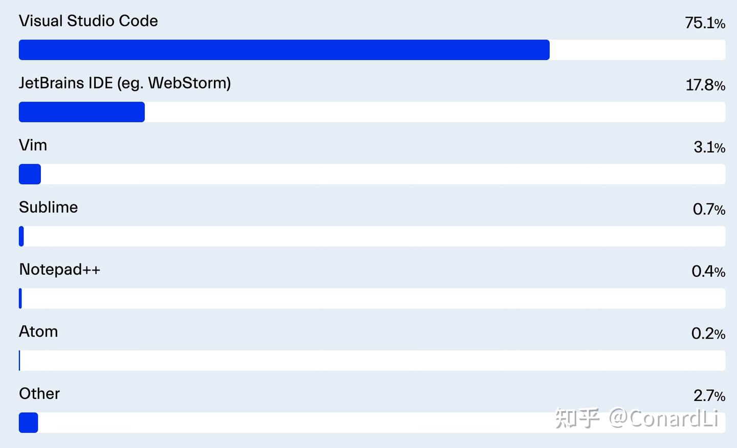 值得注意的是,今年的结果与 2022 年非常相似,VS Code、JetBrains 工具和 Vim 的使用率变化不超过 1%。
