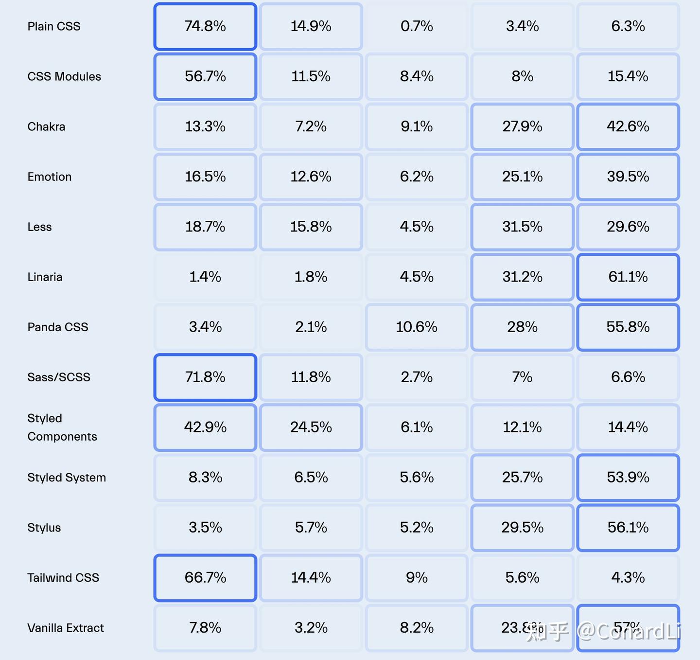 Sass/SCSS 也是一个强有力的竞争者,使用率达到了 71.8%。这表明尽管纯 CSS 被广泛使用,但许多开发者更喜欢 Sass/SCSS 提供的增强特性和预处理能力。