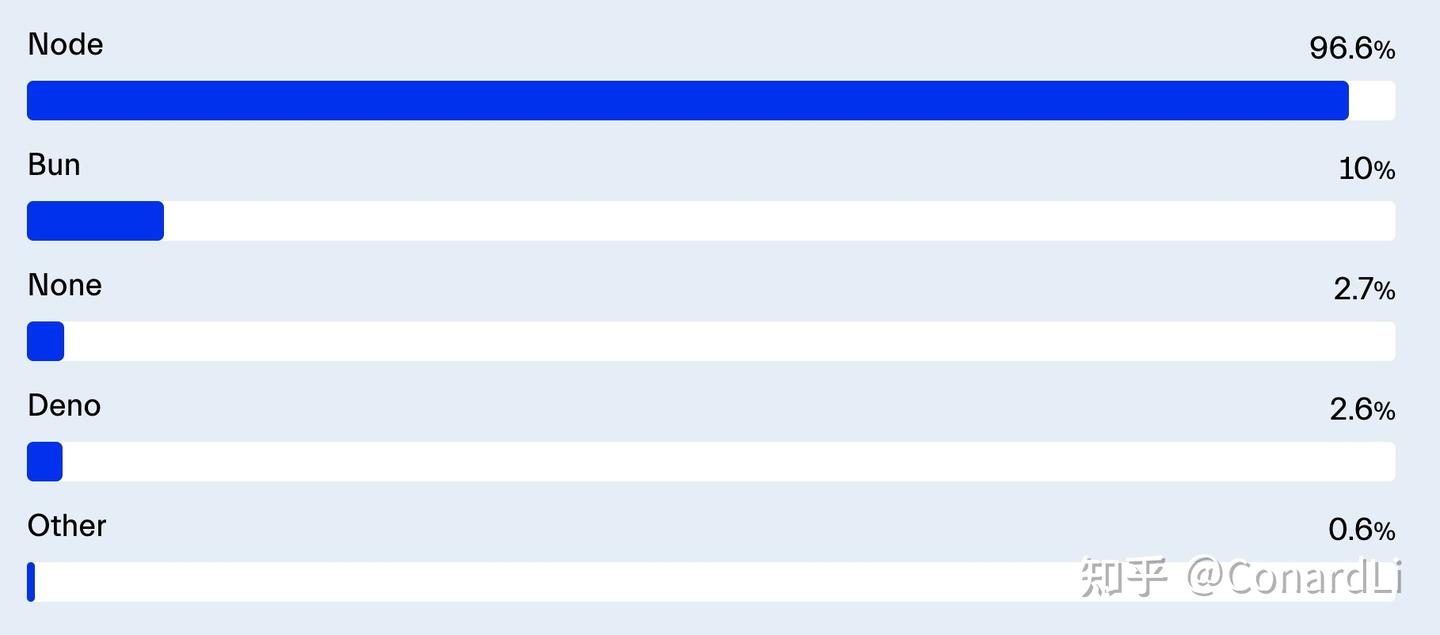 然而,其他 JavaScript 运行时,例如 Bun(10%)和 Deno(2.6%),正在开始开辟自己的市场。