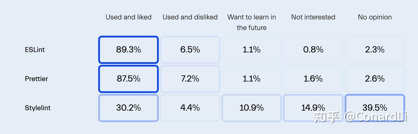虽然使用率不及前两者,但 Stylelint 具有增长潜力,10.9% 的开发者表示有兴趣学习使用它。