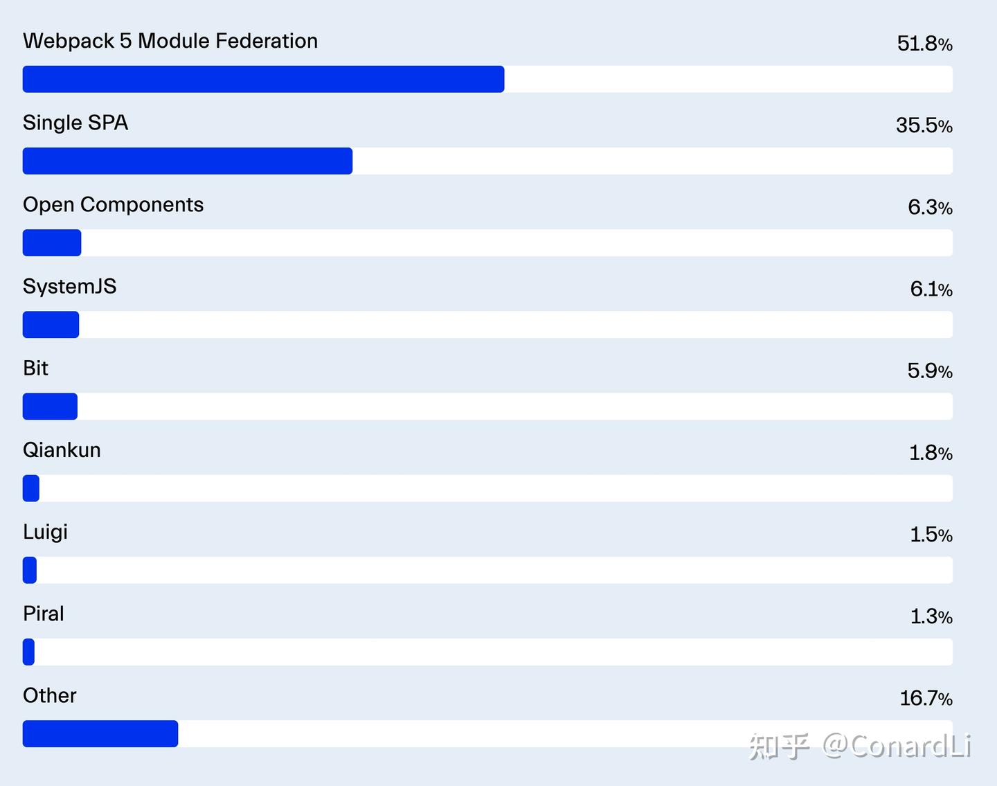 Module Federation(51.8%)正逐渐成为客户端应用程序的标准,不仅用于微前端,还用于需要频繁更新特定系统部件的一体化架构。随着 Module Federation 新版本脱离 Webpack,我预计其采用率将进一步增长。