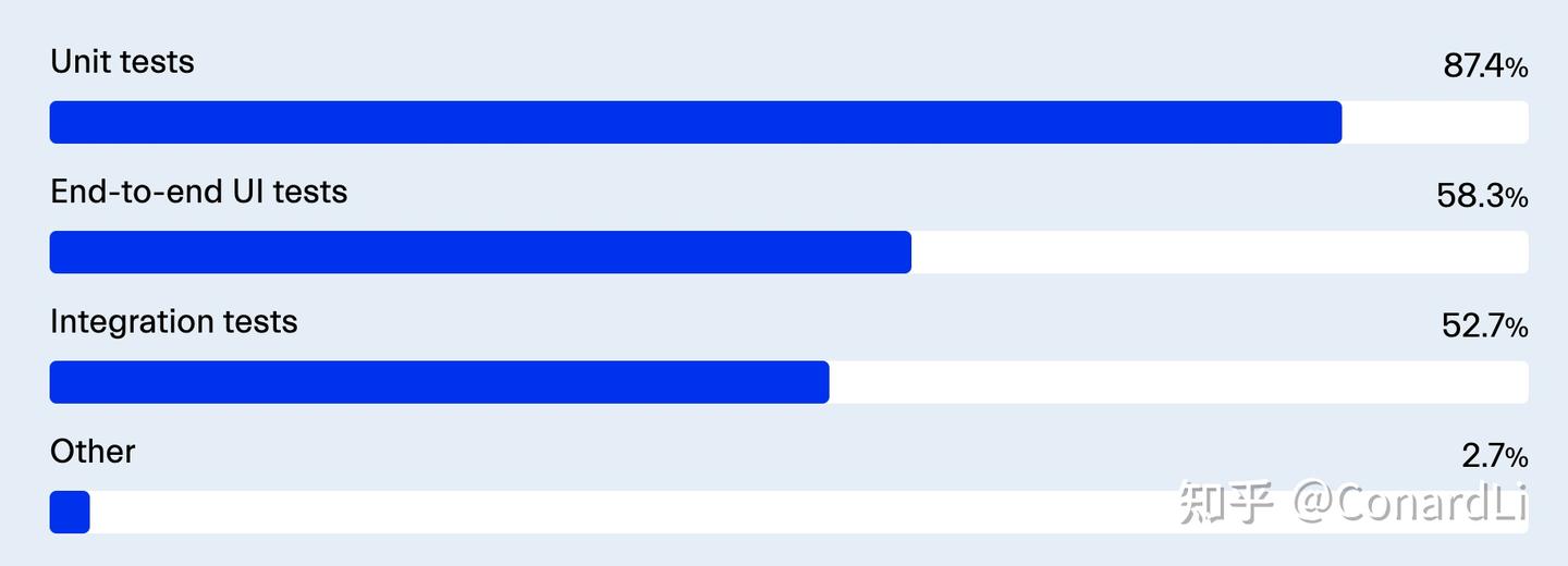 超过 77% 的受访者报告进行了软件测试,这是一个积极的迹象,但大多数人关注的是单元测试,而单元测试本身是不足够的。这并不奇怪,因为单元测试通常较快且易于编写。然而,端到端测试和集成测试同样重要,它们可以确保应用程序如预期般运行。