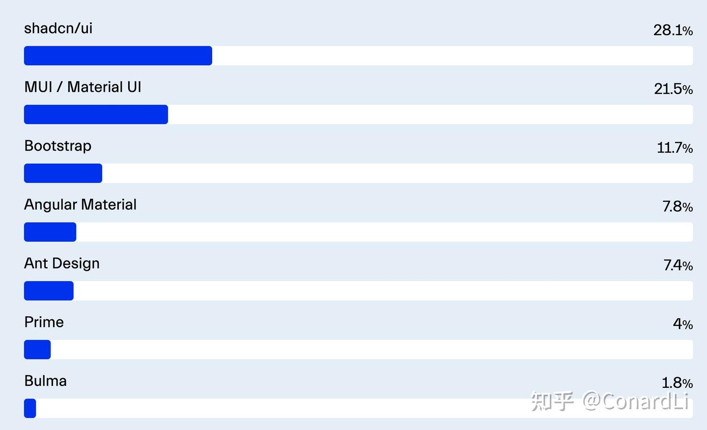 shadcn/ui(28.1%)位居榜首,它结合了 Tailwind、Radix 和 React,但与其他系统不同的是其独特的部署模式。相比之下,MUI(21.6%)和 Bootstrap(11.6%)则分别位列第二和第三。shadcn 通过将实现文件直接拷贝到你的项目中,允许你根据需要自定义 TailwindCSS 类。