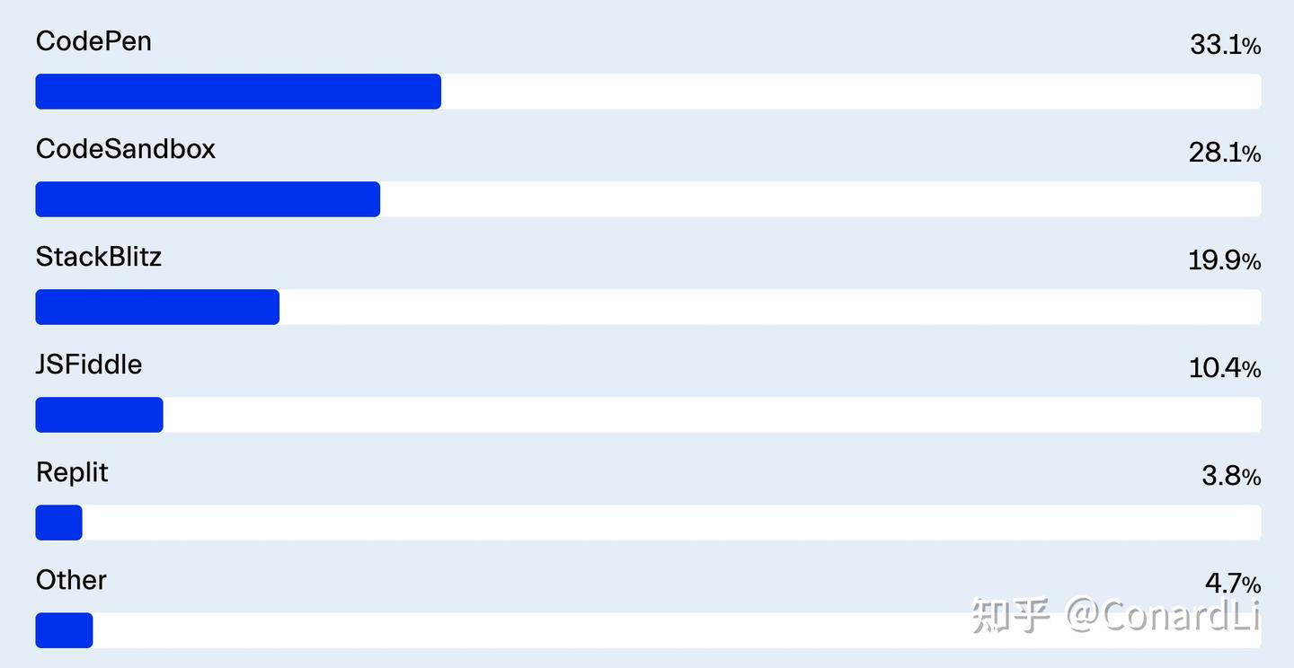 CodeSandbox(28.1%)和 StackBlitz(19.9%)则都是基于 Visual Studio Code 引擎 Monaco 构建,显示出开发者即便在浏览器中也渴望熟悉的桌面体验。