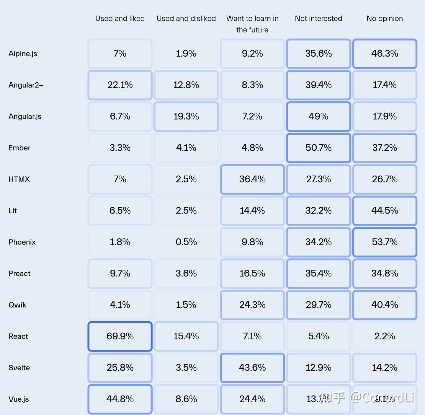 尽管这些是人们首选的流行框架,但我们也看到社区在学习下一步技术上的转变。Svelte 正在吸引越来越多开发者的关注,有43.6%的开发者希望学习 Svelte,紧随其后的是 HTMX 和 Qwik。