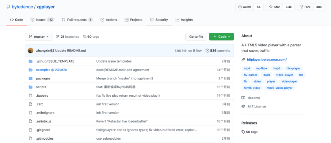 由于他们研发的这款播放器刚好被西瓜视频所用,也就被命名为了「西瓜播放器」,并在GitHub开源,目前已经获得了超过3400颗星,是国内唯一一个从底层开始做的开源前端播放器。