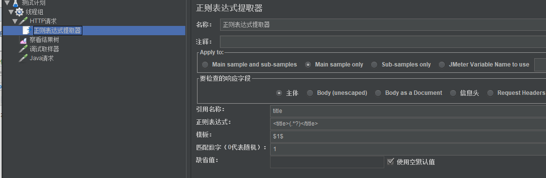 2、Jmeter正则表达式提取器控制面板,截图如下
