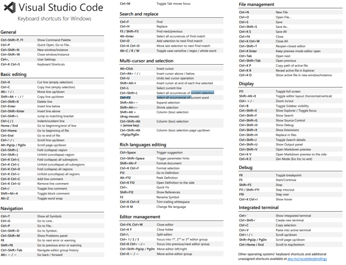 VS Code还支持无鼠标操作,Windows版的VS Code所有功能快捷键如下图所示: