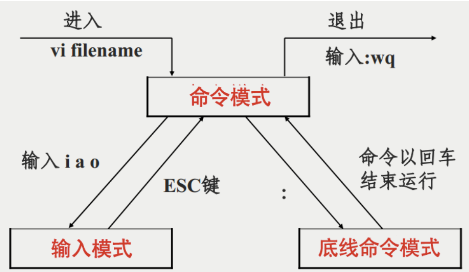 vim是一款功能强大的文本编辑器,拥有命令模式、输入模式和底线命令模式三种模式。模式间切换见下图: