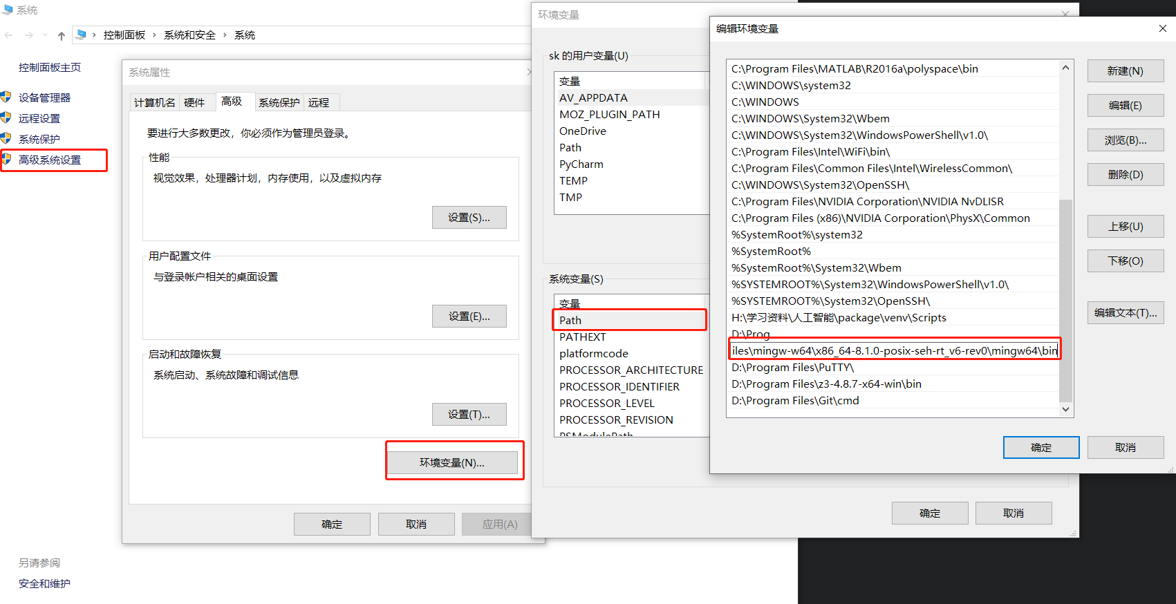 下载完成之后解压到自己想要的位置,然后把~/mingw64/bin加入环境变量中的系统变量PATH中。