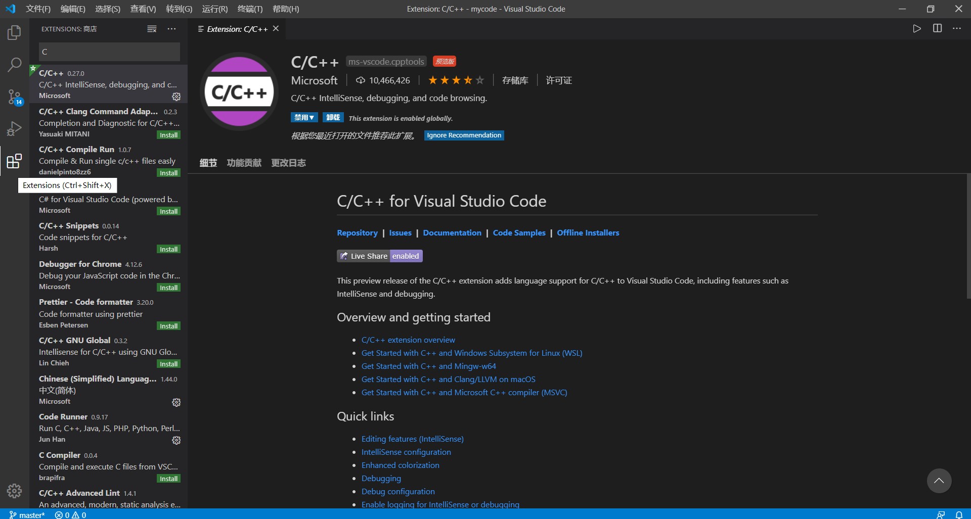 在VS Code的插件中搜索C/C++,安装该插件即可。