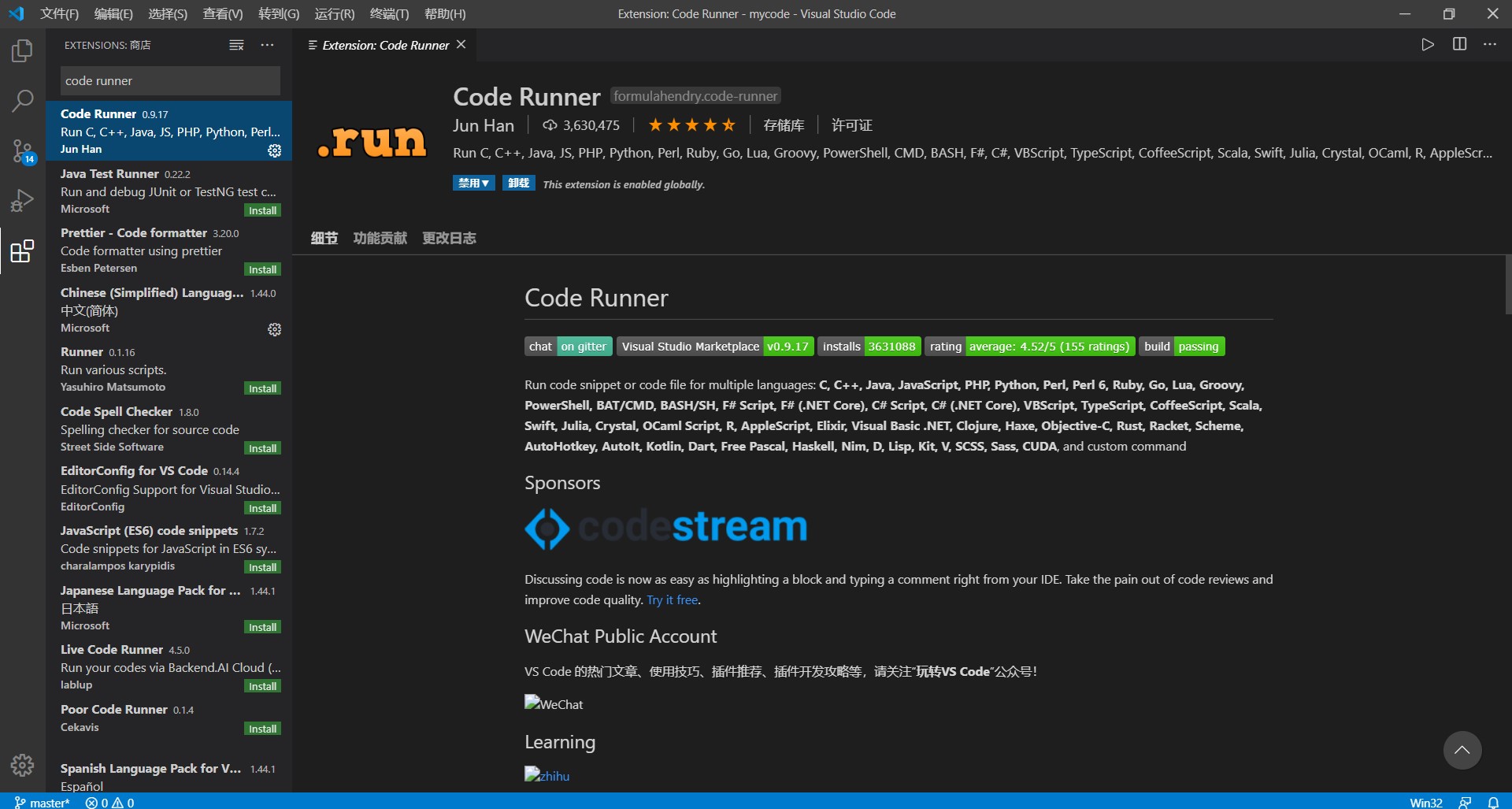 使用Code Runner插件可以直接编译运行代码,不需要手动输入指令。可以直接在VS Code拓展中搜索安装。安装过后可以点击右上角的三角符号运行代码,或者Ctrl+Alt+N运行,或者右键—>Run Code运行。