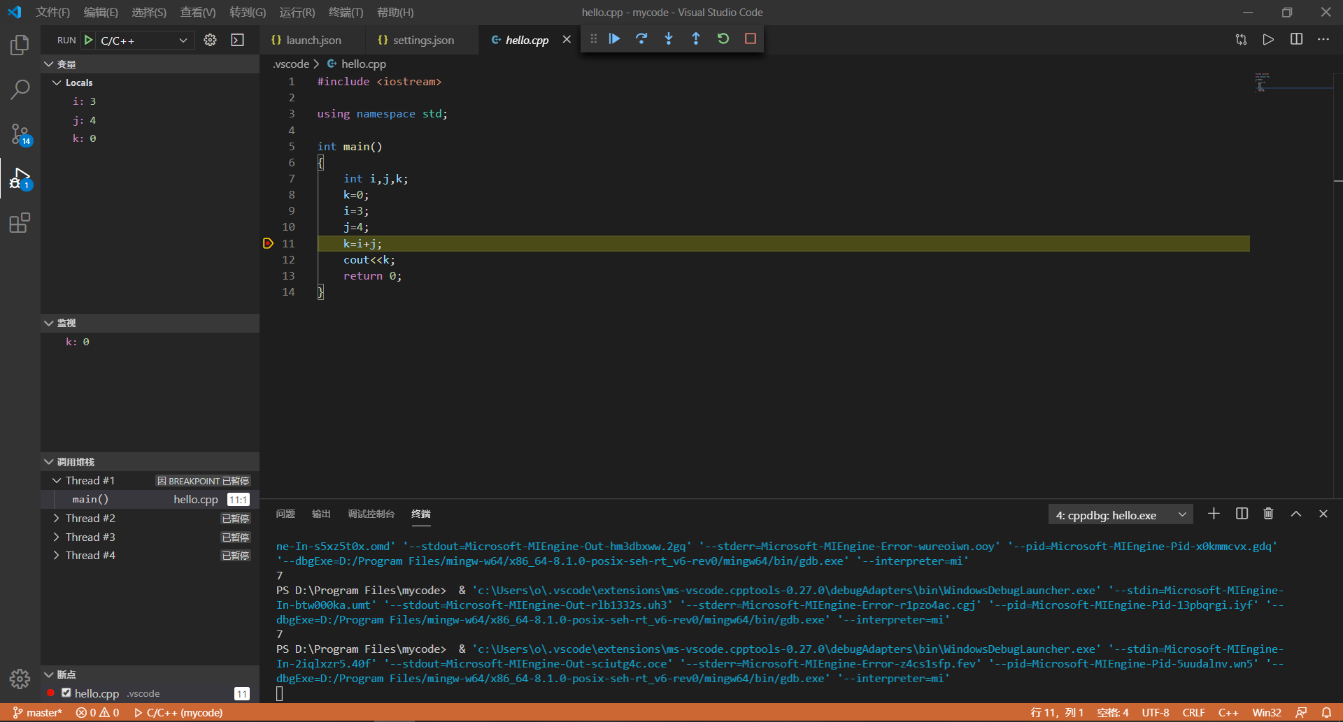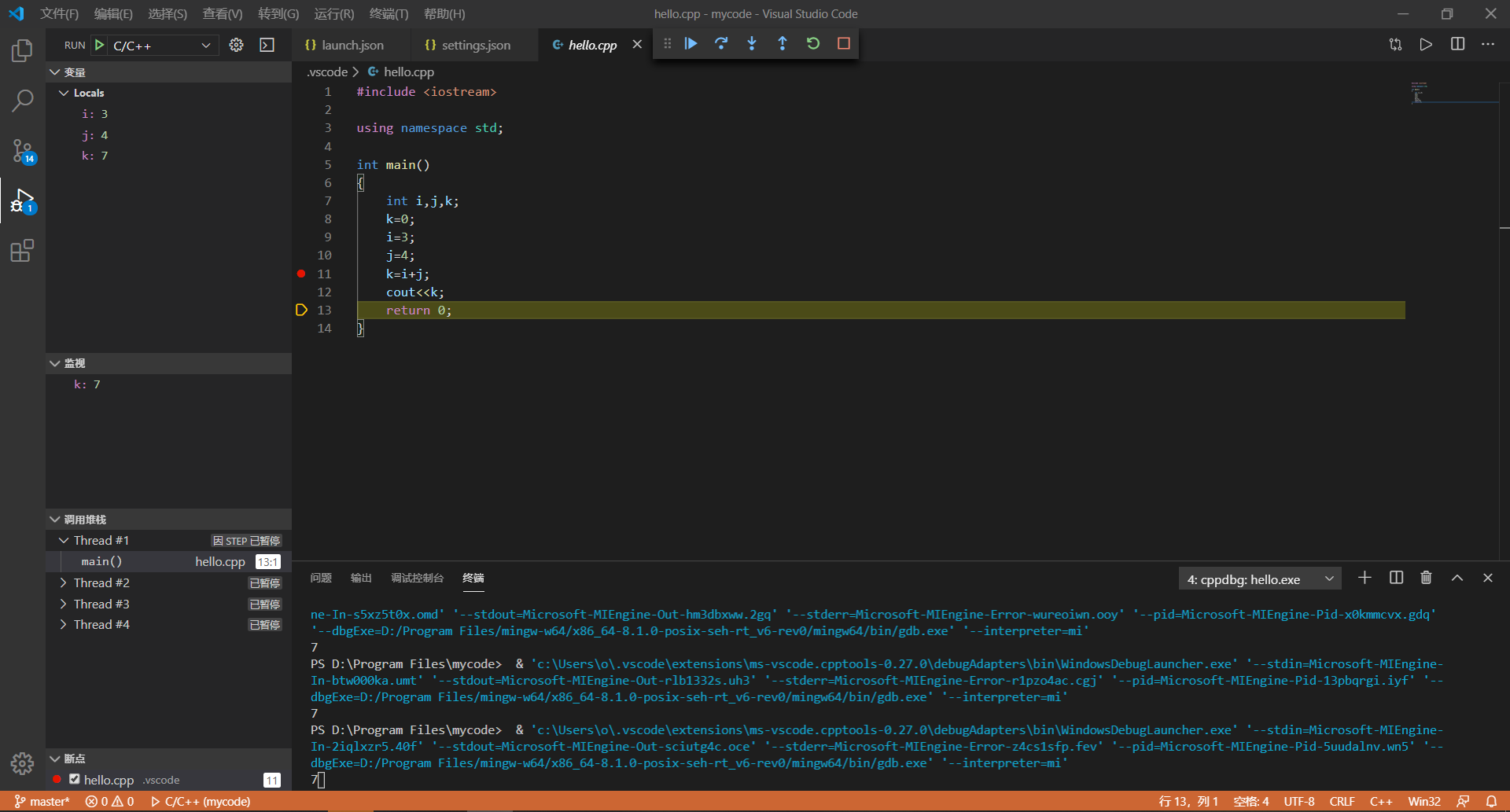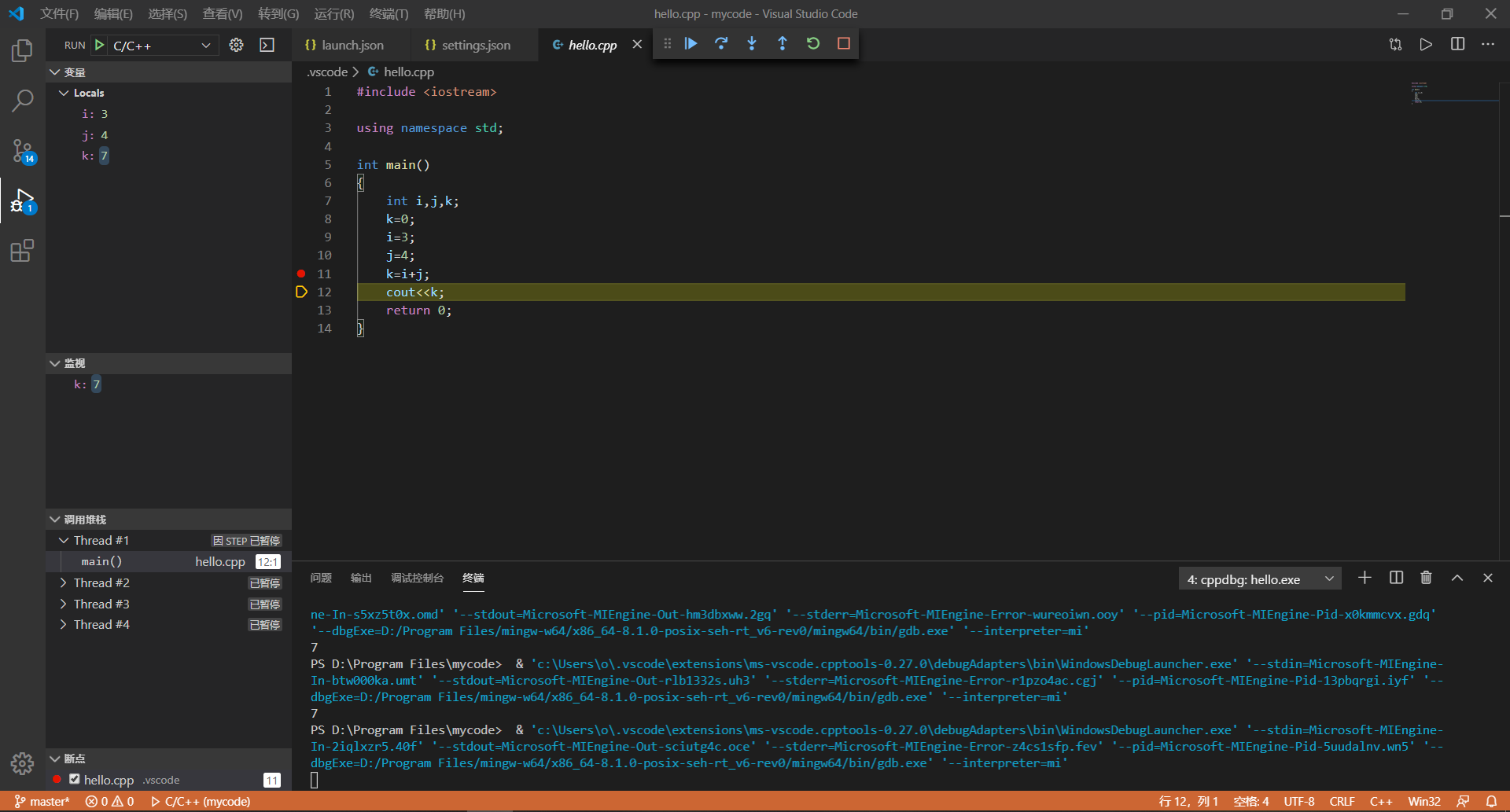 这样,我们完成了hello.cpp的调试、运行,过程还是很简单的。