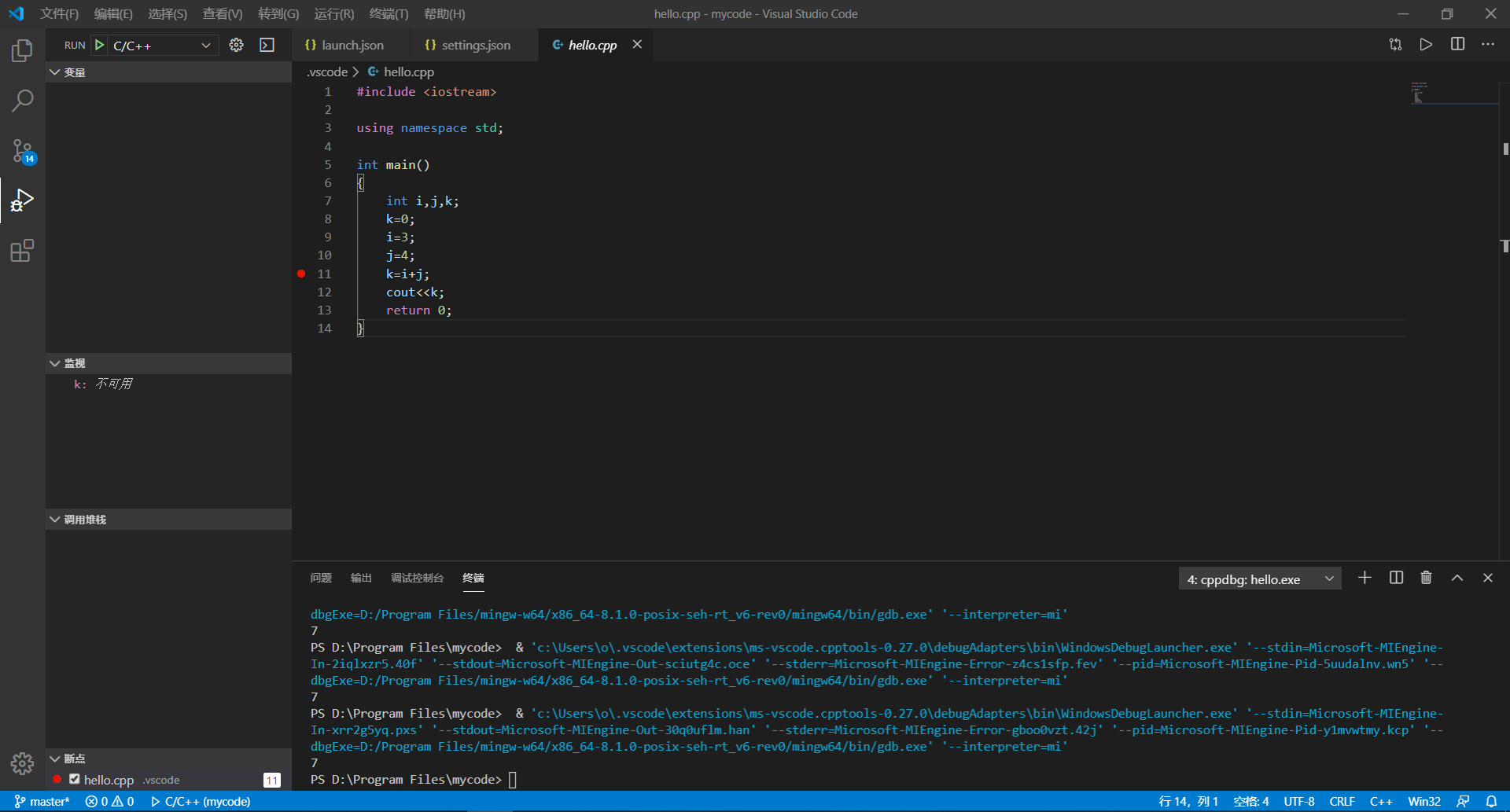 在“k=i+j;”行添加断点(直接在该行左侧单击即可),F5进入调试: