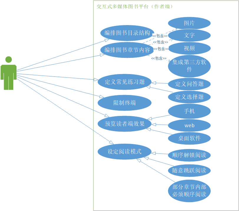 - 作者可以编排图书的目录结构、章节内容,章节内容中包括图片、视频、文字、和集成第三方软件边学边练,能定义常见练习题比如问答题、选择题。