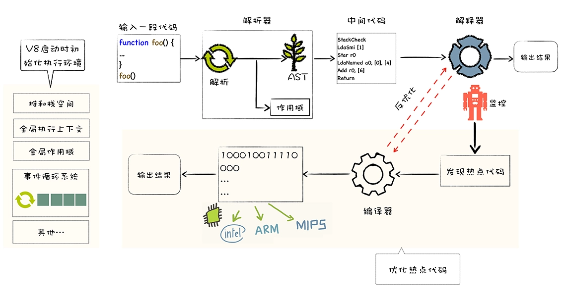 要想充分了解V8是怎么工作的,除了要分析编译流水线,我们还需要了解另外两个非常重要的特性,那就是事件循环系统和垃圾回收机制。