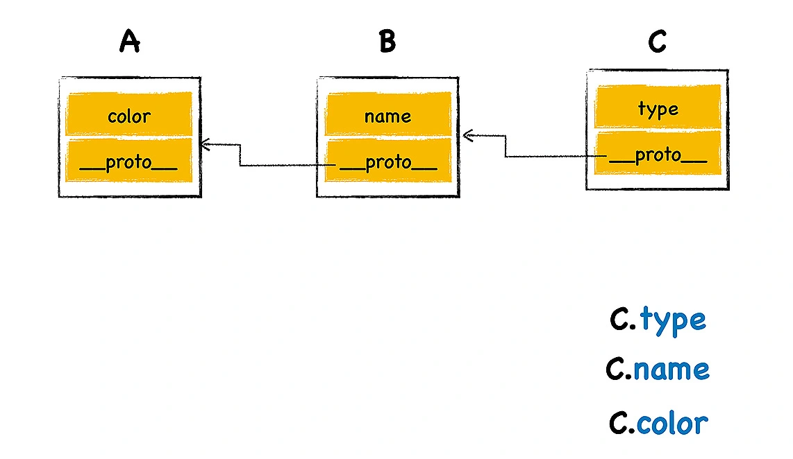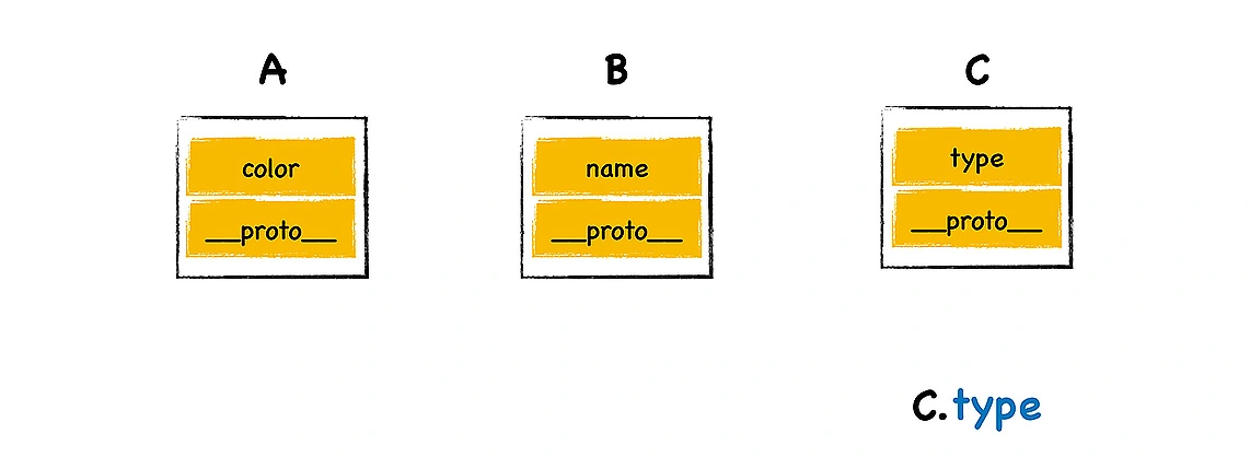 从图中可以看到,对象A有个属性是color,那么通过C.color访问color属性时,V8会先在C对象内部查找,但是没有查找到,接着继续在C对象的原型对象B中查找,但是依然没有查找到,那么继续去对象B的原型对象A中查找,因为color在对象A中,那么V8就返回该属性值。