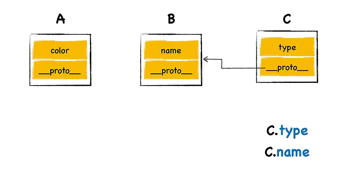 比如我让C对象的原型指向B对象,那么便可以利用C对象来直接访问B对象中的属性或者方法了,最终的效果如下图所示:
