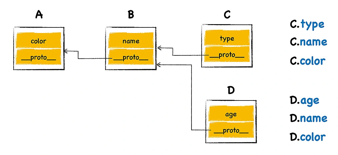 因为对象C和对象D的原型都指向了对象B,所以它们共同拥有同一个原型对象,当我通过D去访问name属性或者color属性时,返回的值和使用对象C访问name属性和color属性是一样的,因为它们是同一个数据。