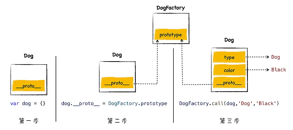 var dog = {} dog.__proto__ = DogFactory.prototype DogFactory.call(dog,'Dog','Black')