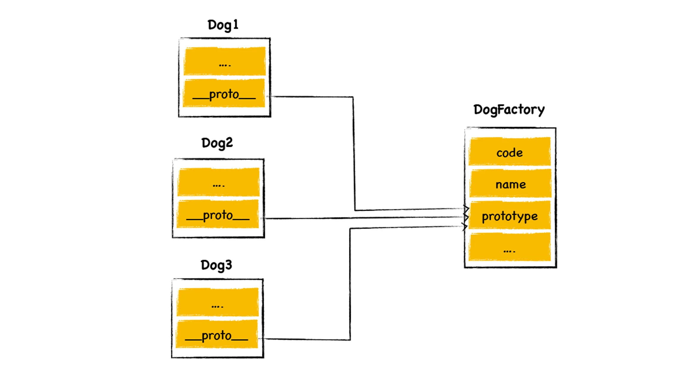 function DogFactory(type,color){ this.type = type this.color = color //Mammalia } DogFactory. prototype.constant_temperature = 1 var dog1 = new DogFactory('Dog','Black') var dog2 = new DogFactory('Dog','Black') var dog3 = new DogFactory('Dog','Black')