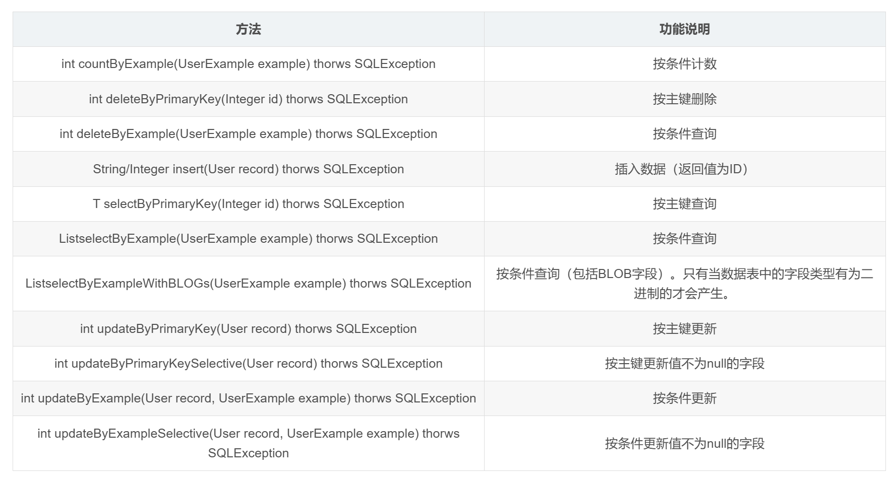 mapper层接口中主要提供一些关于主键和通过Example类作为参数的方法,如下: