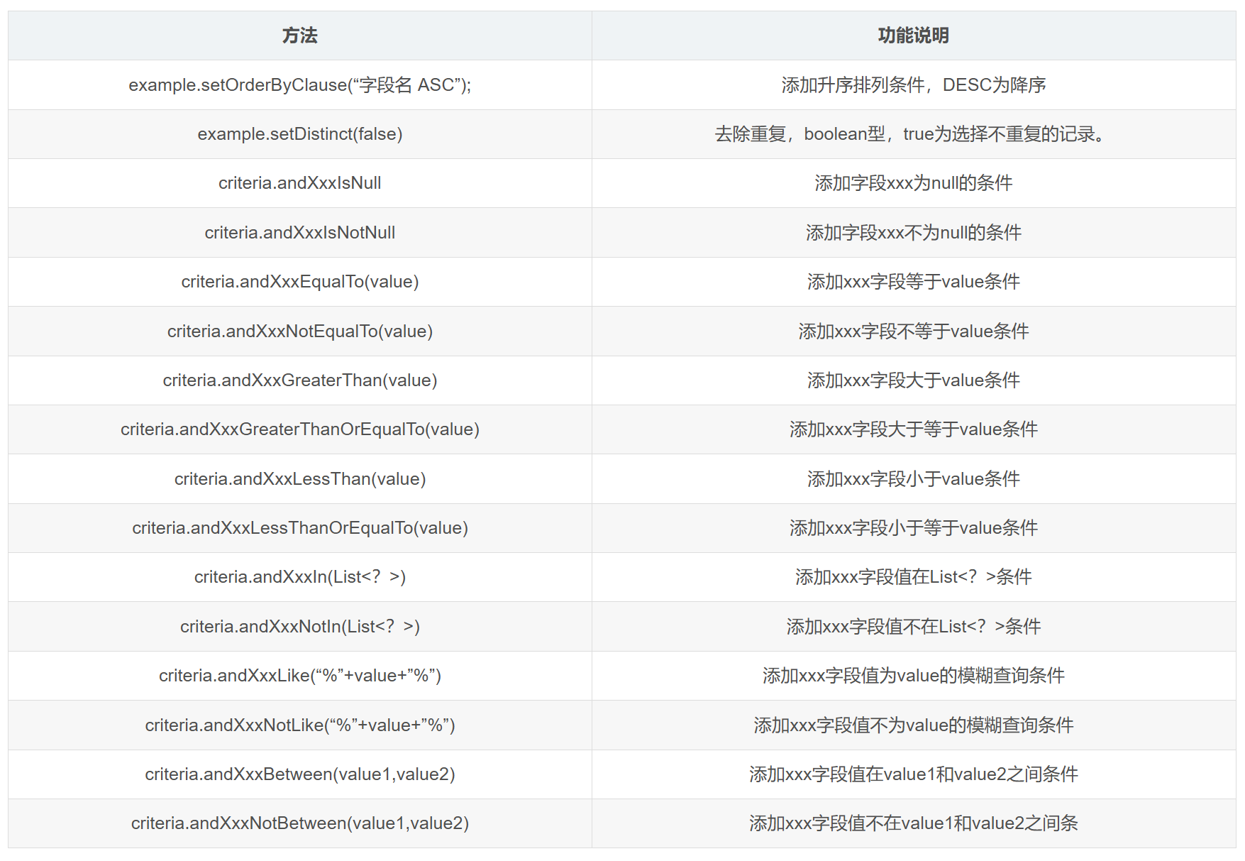 mybatis-generator (逆向工程)会生成实例以及实例对应的Example,其主要作用就是能够自己组装sql语句中where后面的条件。