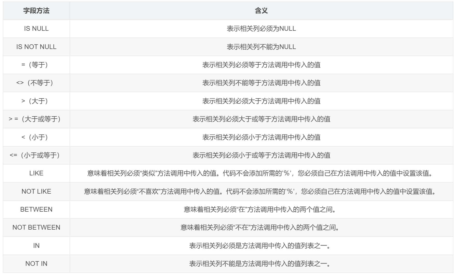 Criteria内部类包括每个字段的andXXX方法,以及每个标准SQL谓词,包括: